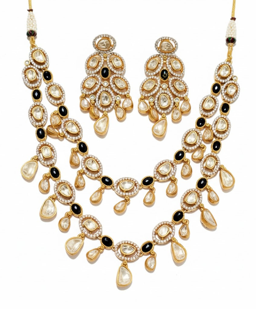 Elevate your ethnic grace with this exquisite double-layered Polki necklace and earring set. Crafted with a regal gold-tone finish, the set features timeless Kundan-style Mozo uncut diamonds beautifully contrasted by deep navy stones. The intricate teardrop hangings and delicate beadwork create a majestic silhouette, making it the perfect statement piece for weddings and festive celebrations