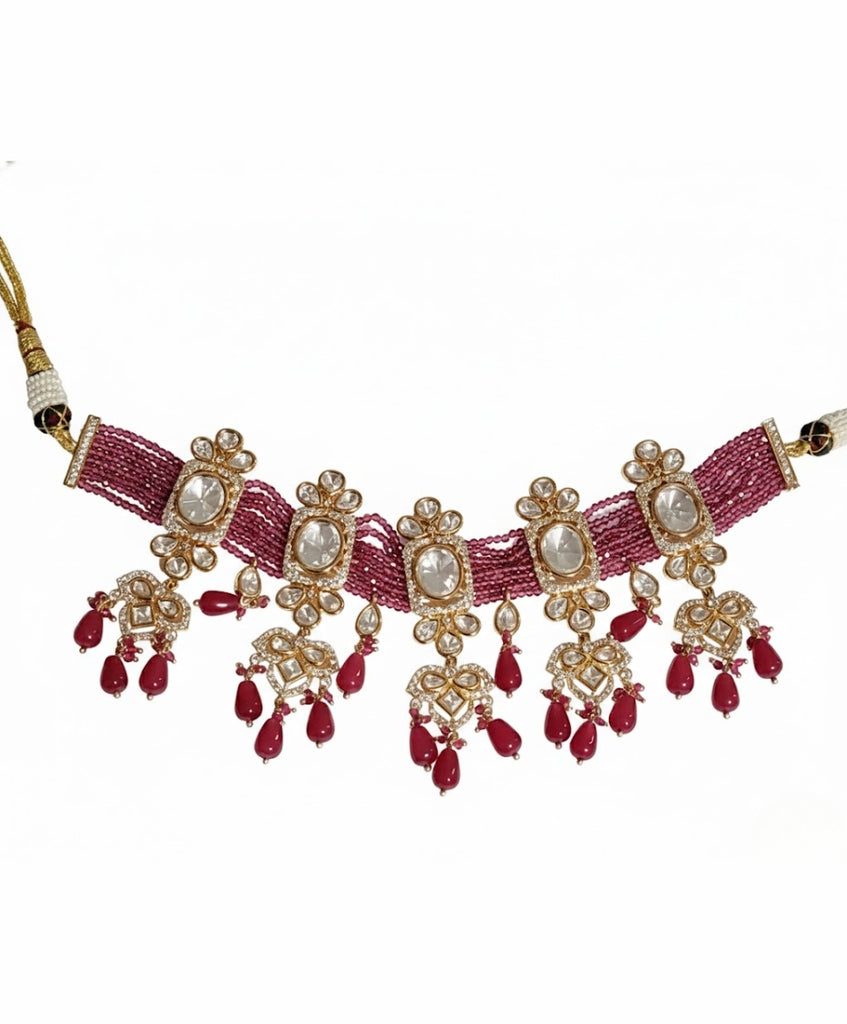 An exquisite choker set featuring a rich band of deep magenta/ruby beads, adorned with intricate, gold-plated Kundan/Polki motifs. Each motif is set with dazzling clear stones and finished with delicate ruby teardrop drops. Complete with matching hanging earrings, this set is the definition of bridal grandeur and traditional opulence. Perfect for weddings and high-end festive celebrations.