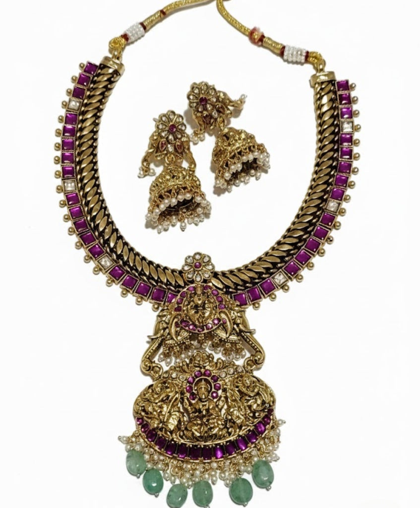 A magnificent antique gold-plated choker and earring set featuring intricate South Indian temple jewellery craftsmanship. The broad necklace band is accented with vibrant purple (amethyst/ruby) stones, leading to a detachable pendant adorned with divine motifs (Lakshmi/Ganesha). Finished with stunning green agate/jade drops and matching jhumka earrings, this is a truly regal set perfect for classical occasions and weddings.