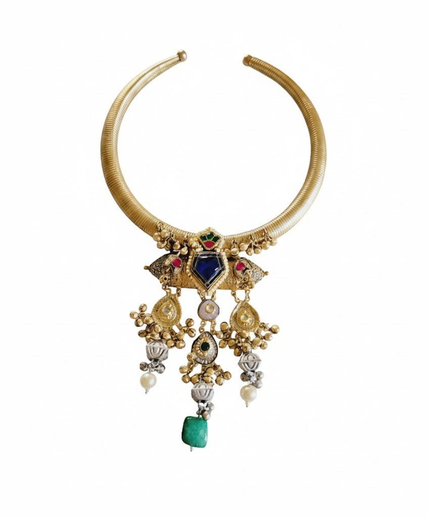 A striking Antique Gold-Toned Open Choker necklace featuring a bold, textured neckpiece. The central design showcases a multi-layered, ornate pendant with traditional charm, detailed with vibrant stones (deep blue, red, green), and finished with clusters of gold ghungroos (small bells) and elegant pearl drops. This unique statement piece draws inspiration from traditional Indian folk and temple jewelry, perfect for sarees, ethnic wear, and festive celebrations.