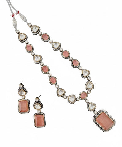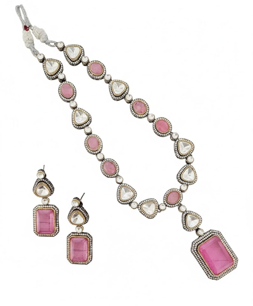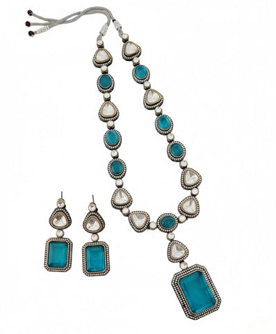 This elegant jewelry set features a sophisticated fusion of traditional Moissanite Polki and modern aesthetics. The necklace is designed with a series of Kundan-bordered teardrop and oval stones, leading to a bold, rectangular pendant for a striking look. Crafted with a vintage-inspired dark metal finish and available in vibrant jewel tones, this long-length set comes with matching drop earrings, making it a versatile choice for contemporary ethnic wear.