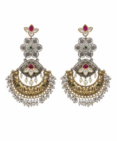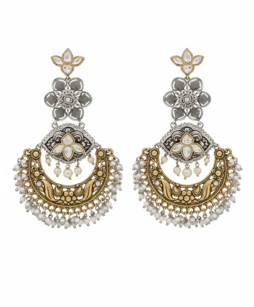 Meticulously crafted with a high-quality dual-tone finish of antique silver and matte gold, these earrings showcase intricate Kundan-style stonework and delicate pearl borders. Whether you choose the bold, geometric drops with vibrant moon-crest accents or the grand, floral-inspired crescent moons adorned with cascading seed pearls, each pair is a masterpiece of detail. These lightweight yet statement-making pieces are the perfect companion for weddings, grand celebrations, and festive occasions.